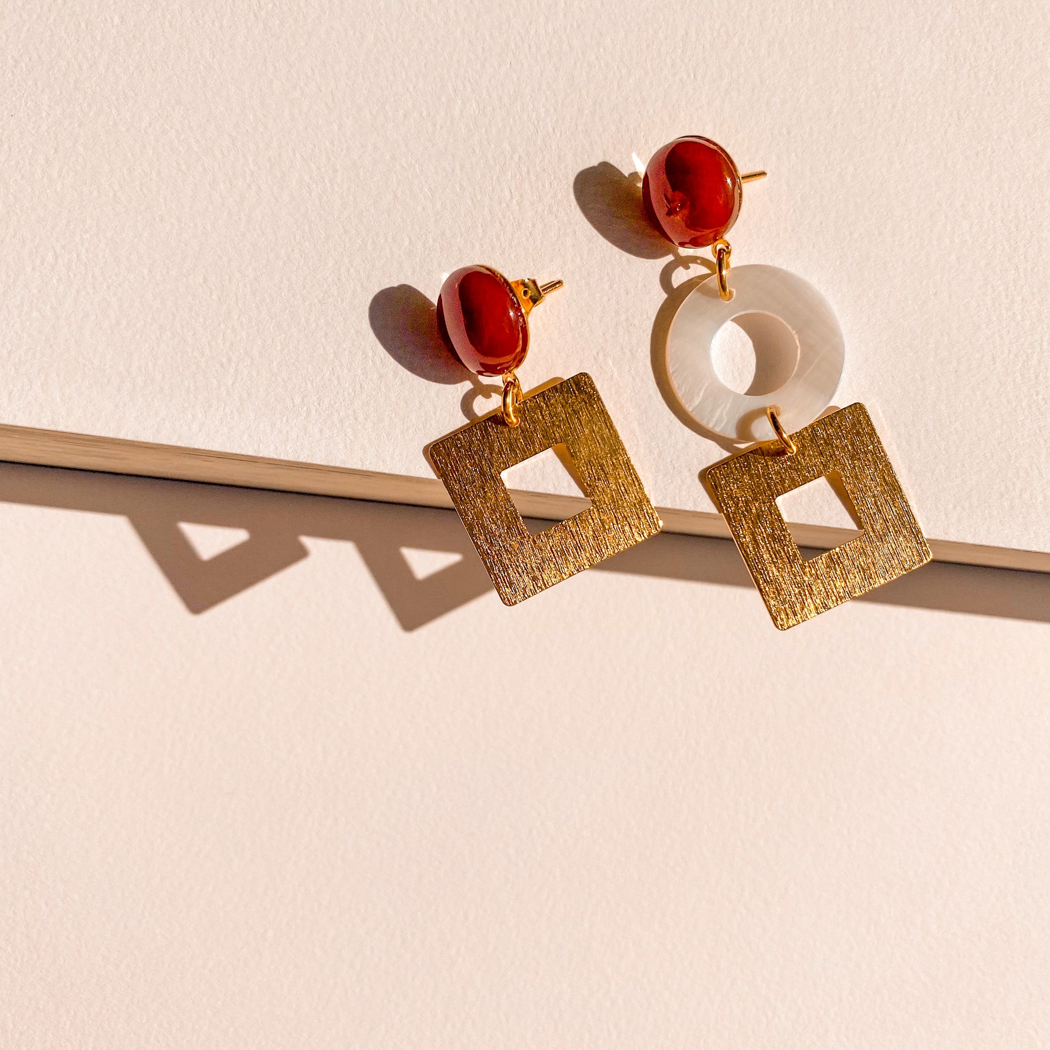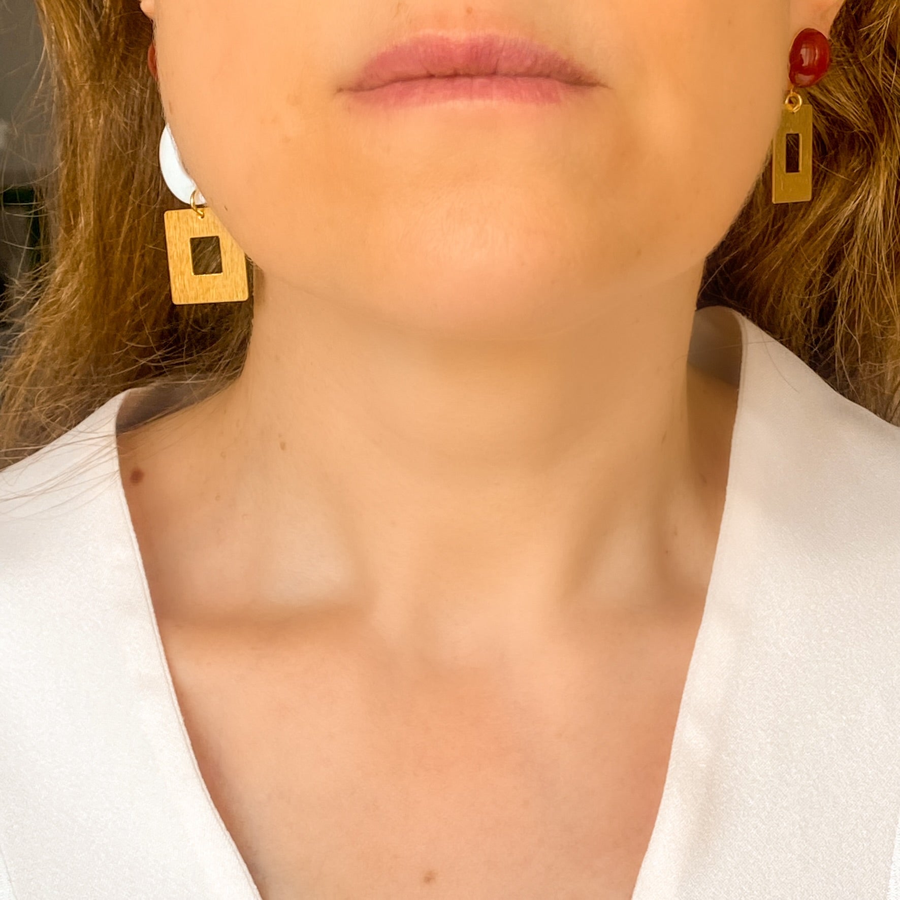 Leur duo cornaline + nacre + doré apporte une touche artistique à un look simple : chemise fluide, top en soie, robe épurée. Leur asymétrie fait qu'elles deviennent la pièce signature d’un look.