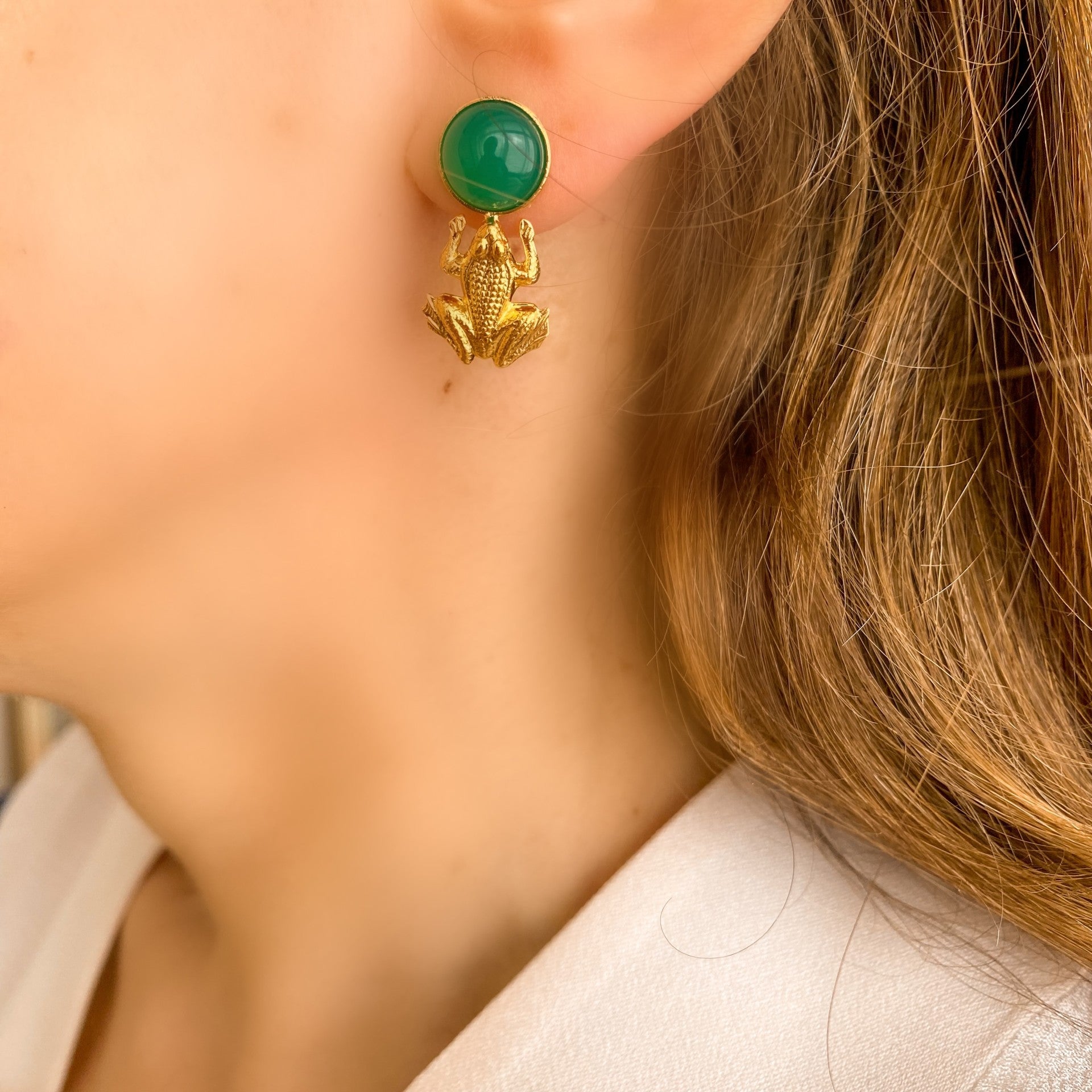 Charmantes, lumineuses, et délicatement porte-bonheur, les boucles d'oreilles grenouille associent la douceur d'un motif grenouille doré à l'énergie vibrante et l'agate verte. Symbole de chance, et de renouveau et de transformation, la grenouille devient aussi un talisman moderne, tandis que l'agate verte - pierre naturelle aux nuances acidulées - apporte une touche de fraîcheur, d'équilibre et d'harmonie.