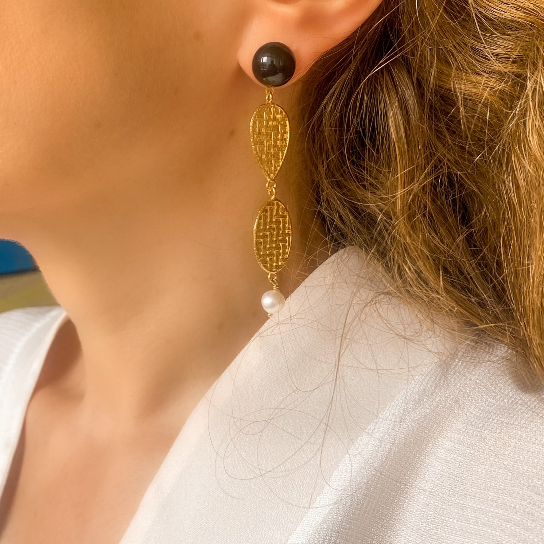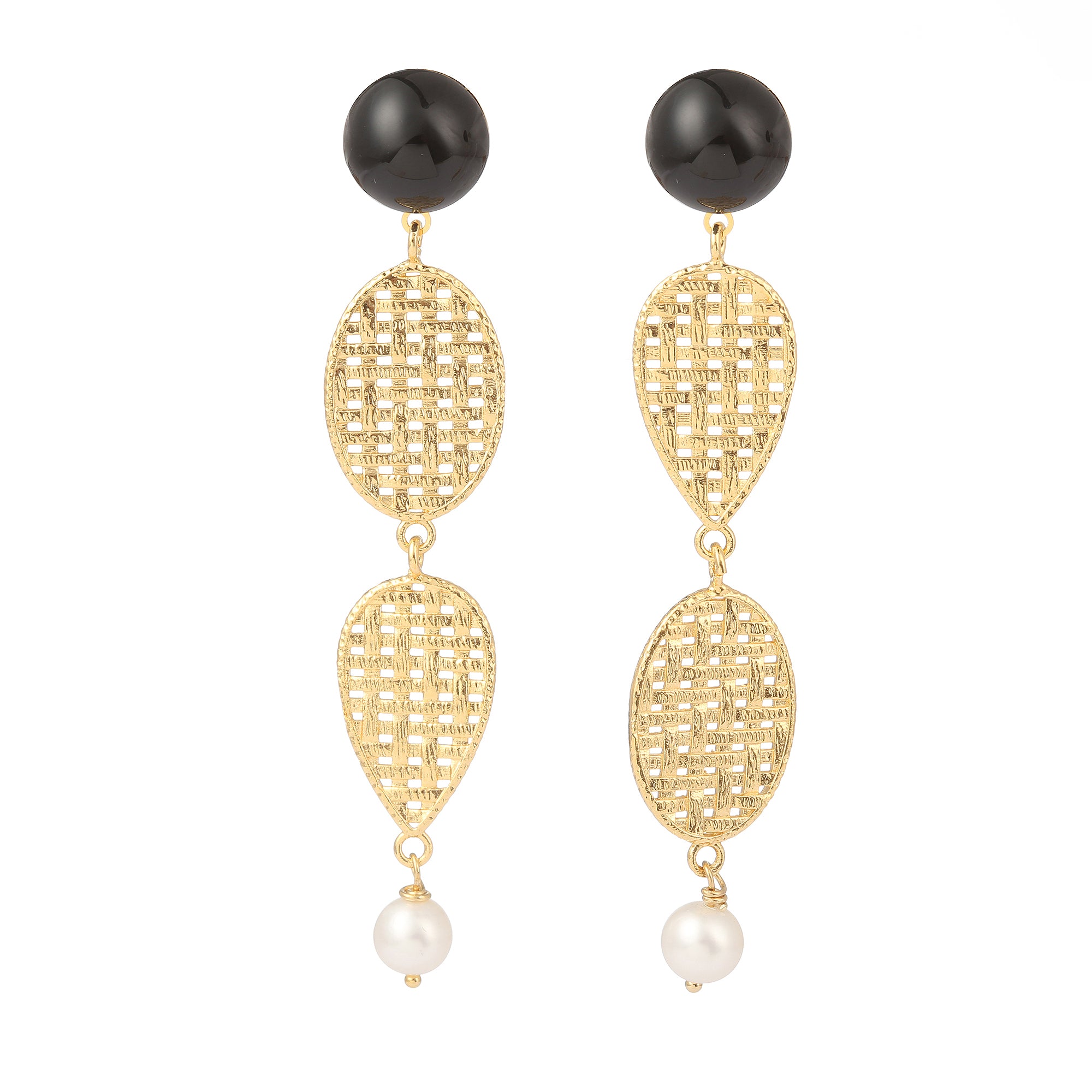 Intenses, lumineuses et résolument affirmées, les Boucles d’oreilles Liz agate noire associent la profondeur élégante de l’agate noire naturelle à la douceur des perles. Leur silhouette pendante XXL crée une présence spectaculaire tout en restant étonnamment légère, idéale pour celles qui aiment les bijoux expressifs et sophistiqués. La structure dorée met en valeur le contraste entre le noir profond de l’agate et l’éclat nacré des perles, offrant un bijou moderne, chic et parfaitement équilibré.
