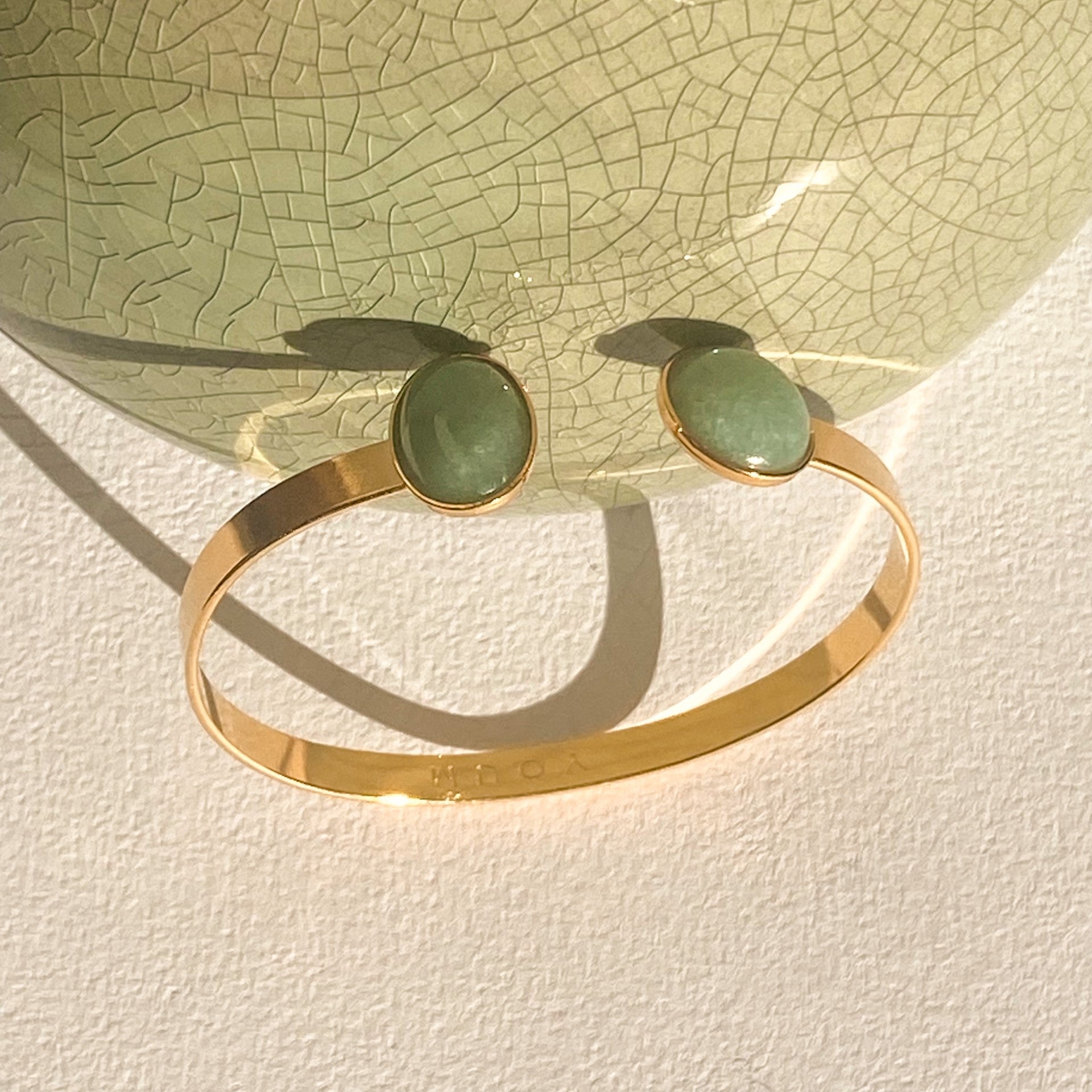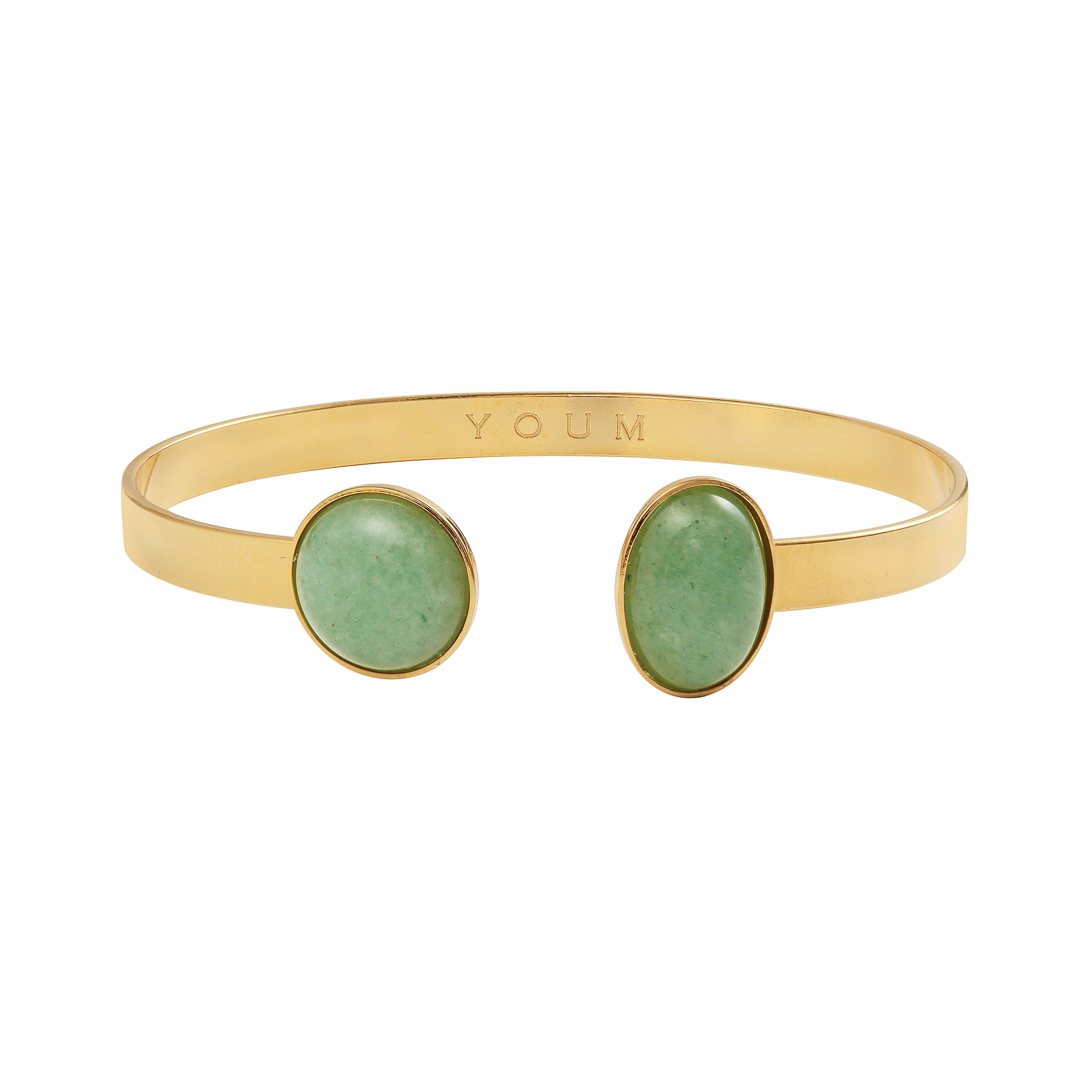 Le jonc Théo doré aventurine est l'un des iconiques YOUM : un bracelet lumineux et minimaliste, sublimé par une pierre naturelle d'aventurine aux nuances vertes douces et apaisantes. Une pièce élégante qui se porte seule ou en accumulation pour un style moderne et raffiné.