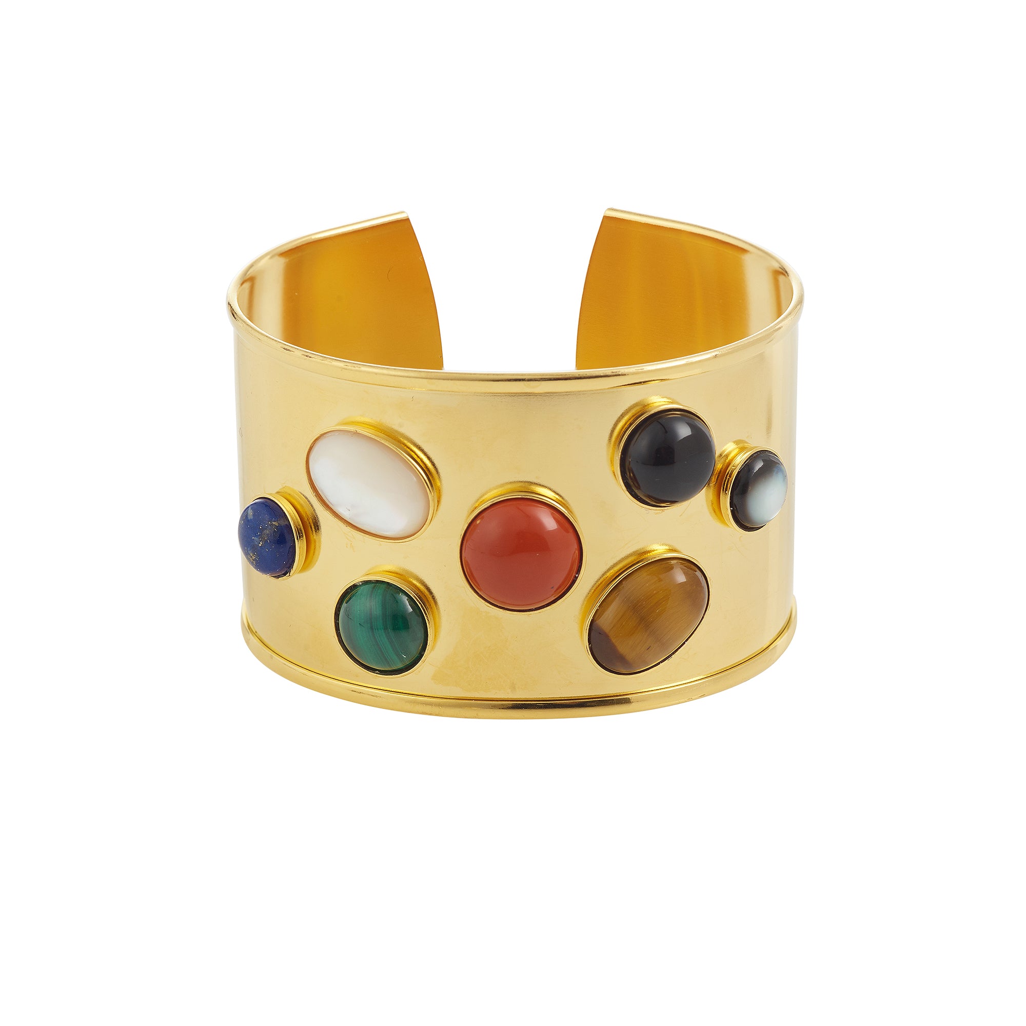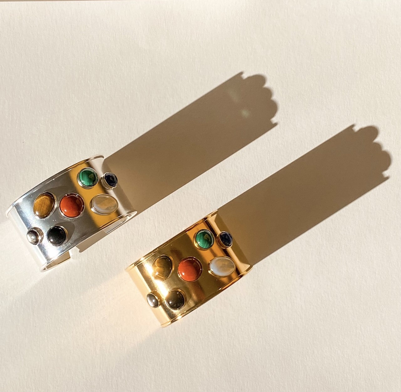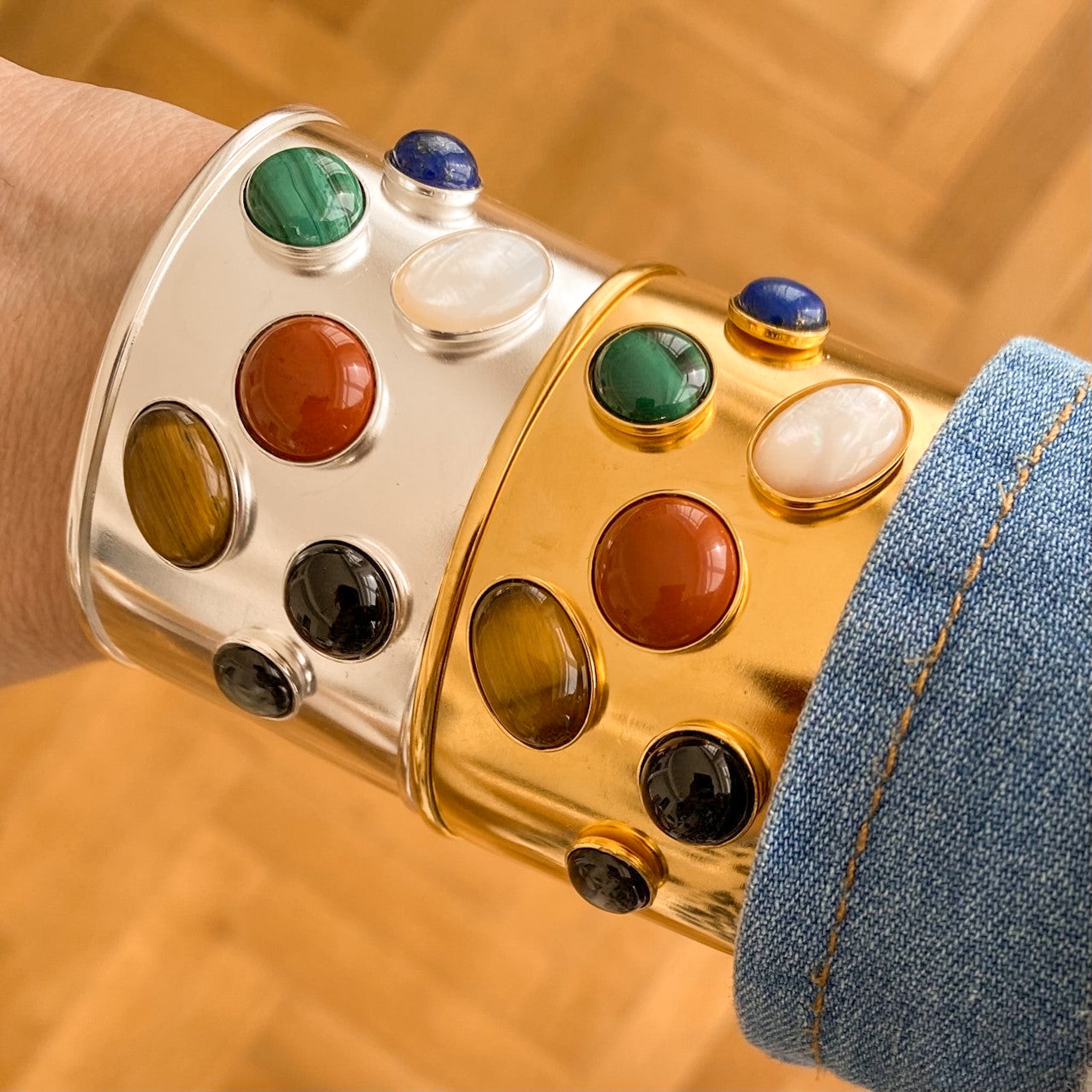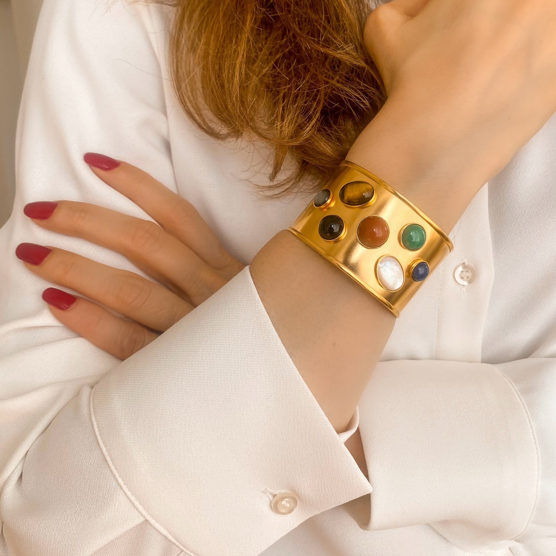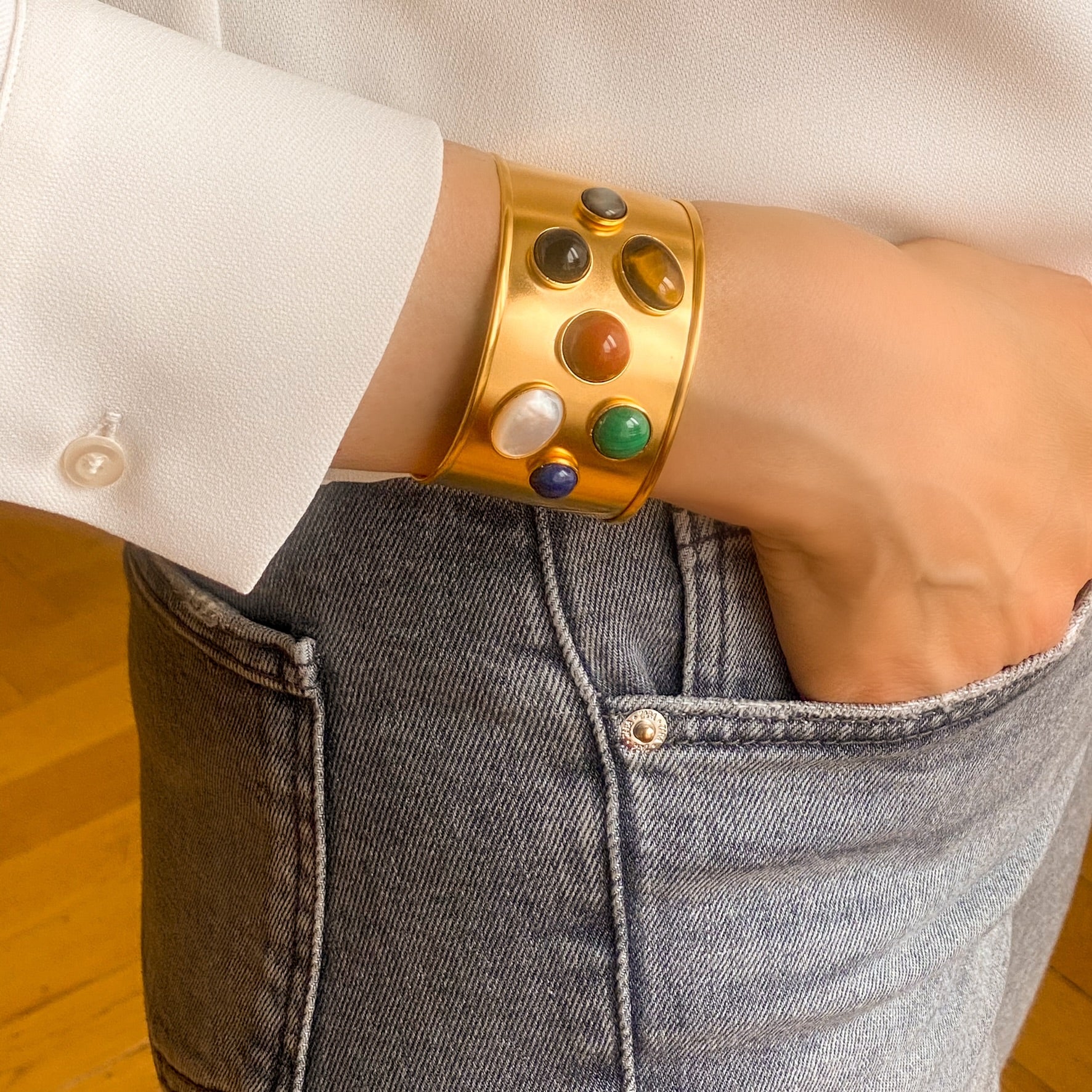 La Manchette Iris dorée est une pièce forte qui mêle l’éclat solaire de la dorure à l’or fin 24 carats à la présence délicate de pierres naturelles. Avec sa largeur de 3,8 cm , elle habille le poignet comme une véritable sculpture, tout en restant confortable grâce à son ouverture ajustable. Le métal doré apporte une chaleur lumineuse, tandis que les pierres créent un contraste organique qui rend chaque manchette unique.Iris est un bijou qui attire l’œil sans jamais en faire trop : une pièce élégante, moderne et intemporelle, pensée pour sublimer une tenue du quotidien comme une silhouette plus habillée.