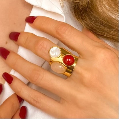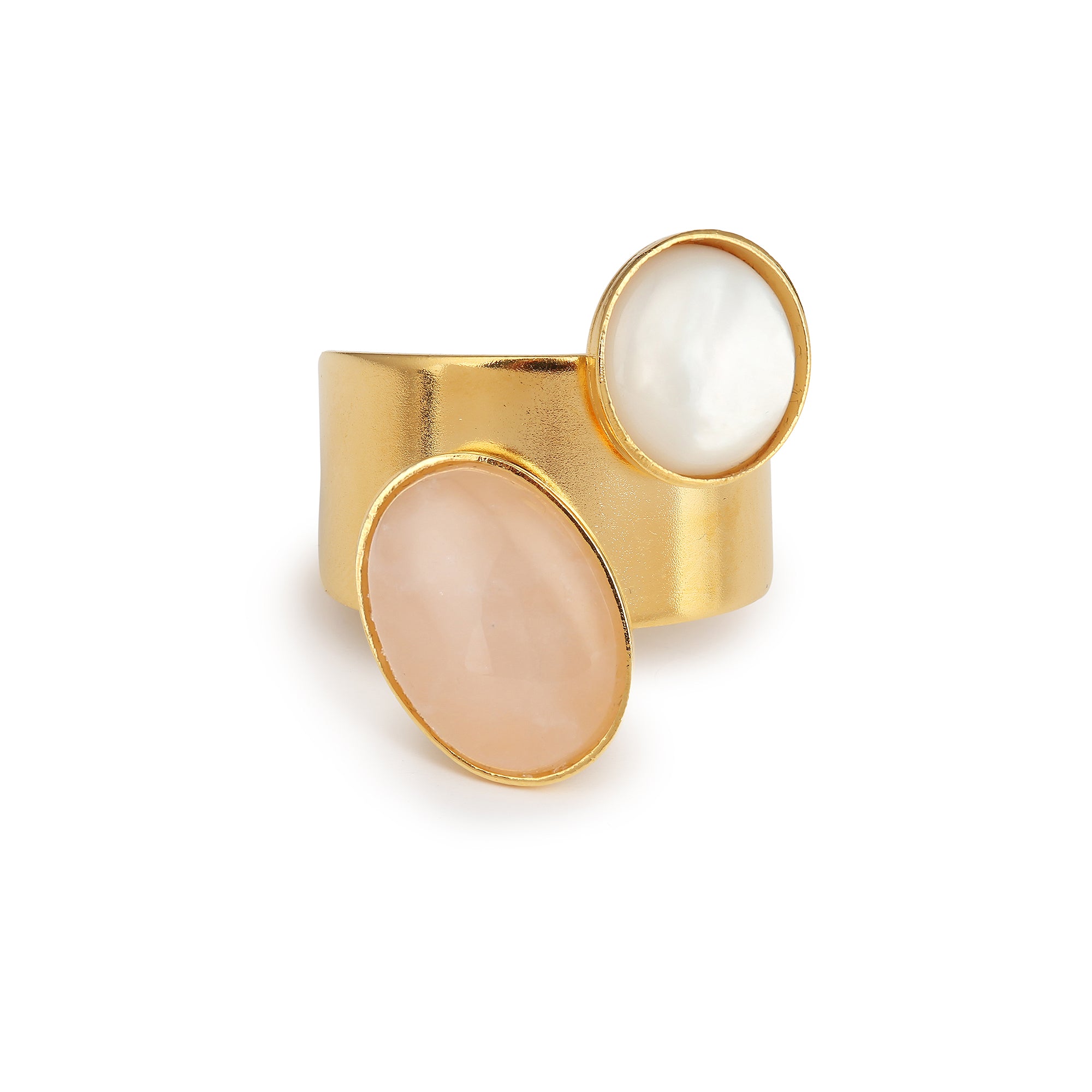 La bague Paola affiche une ligne graphique et contemporaine, portée par l'association du quartz rose et de la nacre blanche. Son design doré, pensé pour s'emboiter avec les autres bagues de la collection, permet de composer des compositions fortes. Portée seule, elle affirme une présence nette; associée à d'autres couleurs, elle crée un jeu de contraste maîtrisé et moderne.