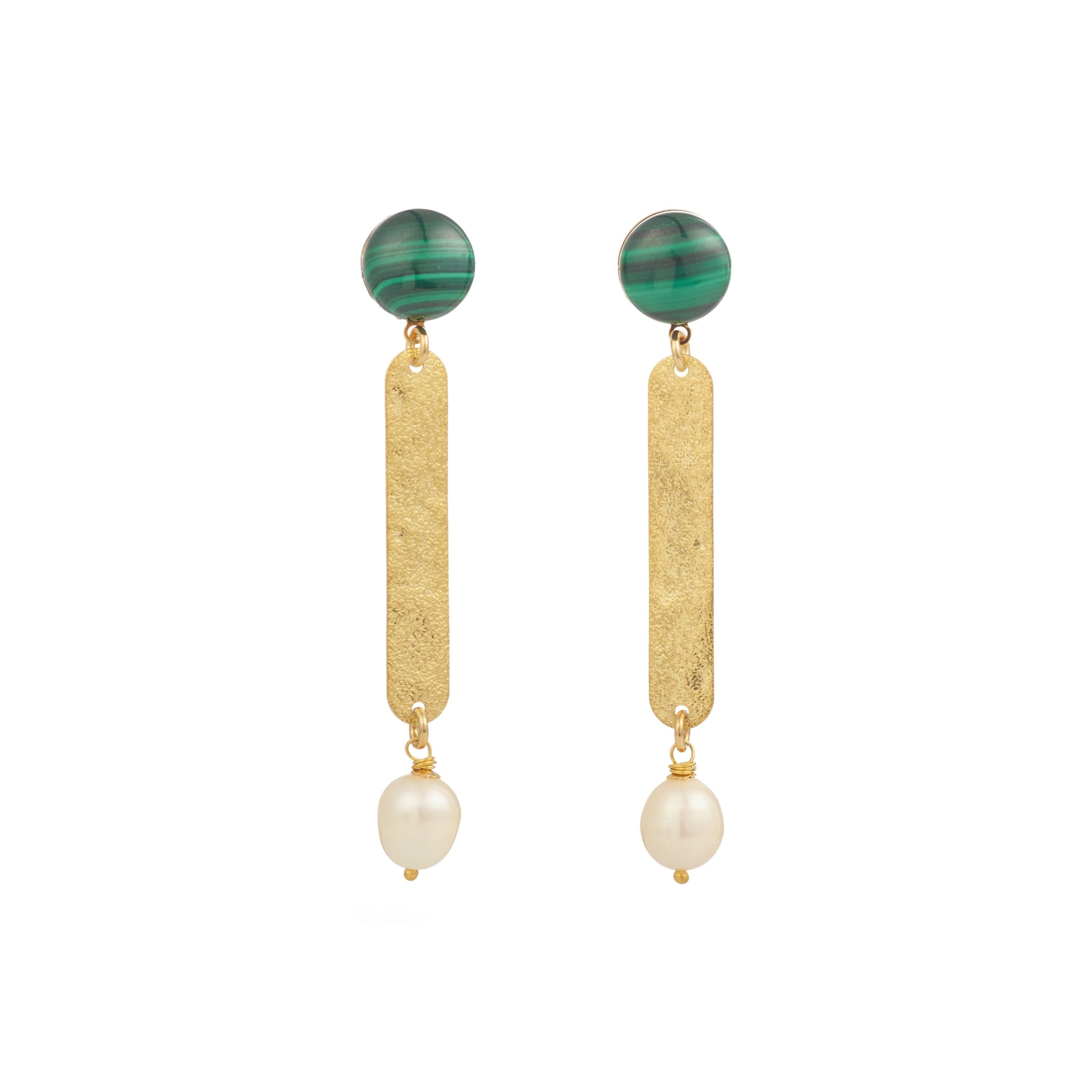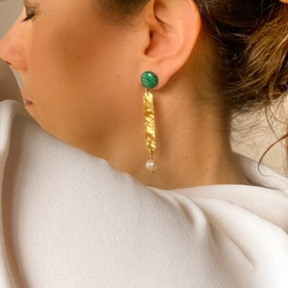 Elles jouent sur un contraste élégant entre la profondeur hypnotique de la malachite verte et l'éclat irisée de la perle blanche. La pierre, traversée de veines naturelles uniques, apporte une présence minérale affirmée, tandis que la perle diffuse une lumière douce et intemporelle. Montées sur du laiton doré à l’or fin 24 carats, elles créent un équilibre subtil entre caractère et délicatesse.