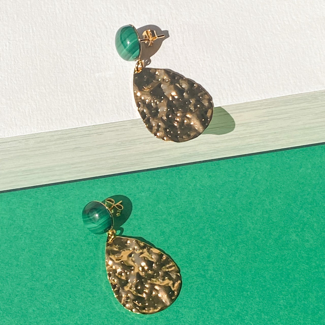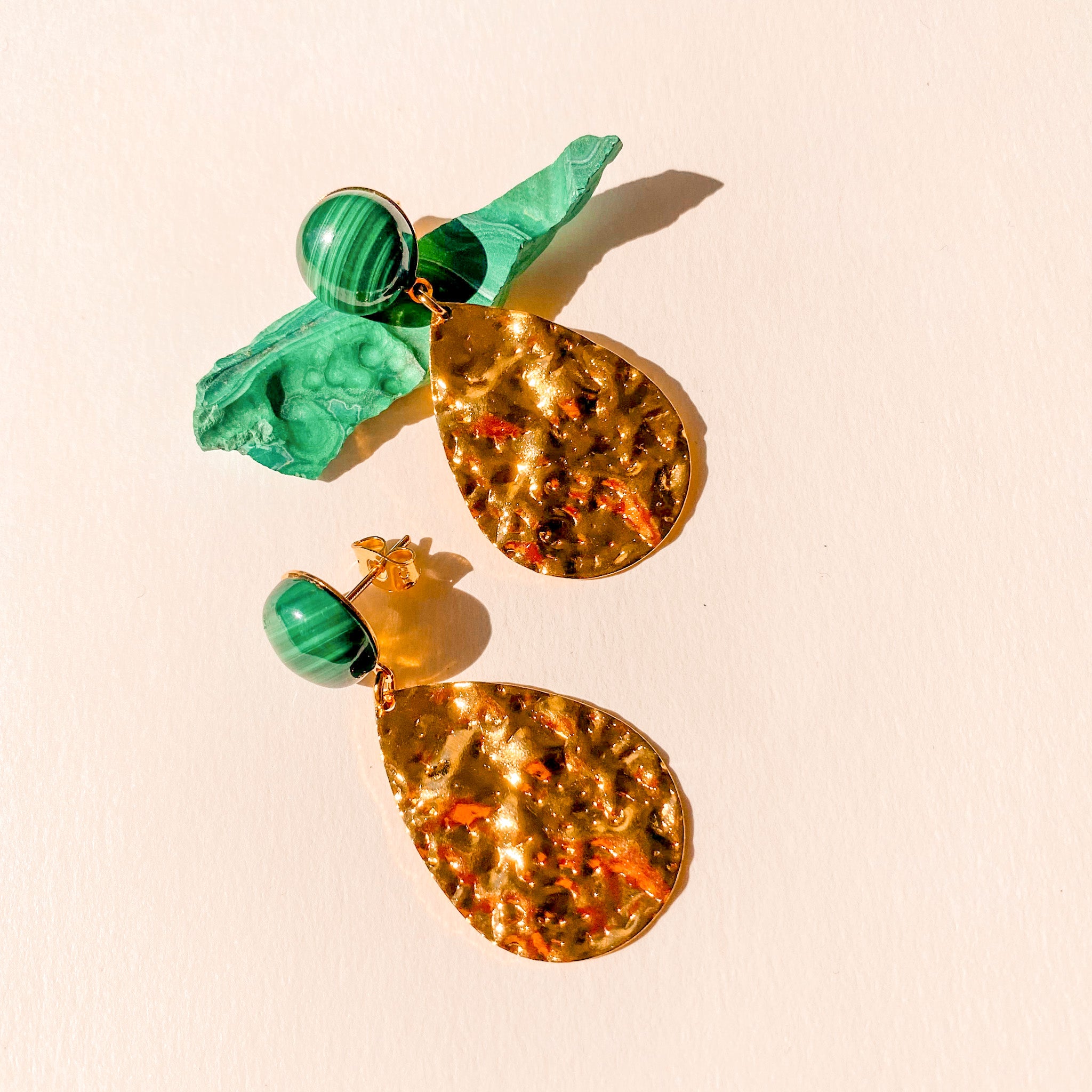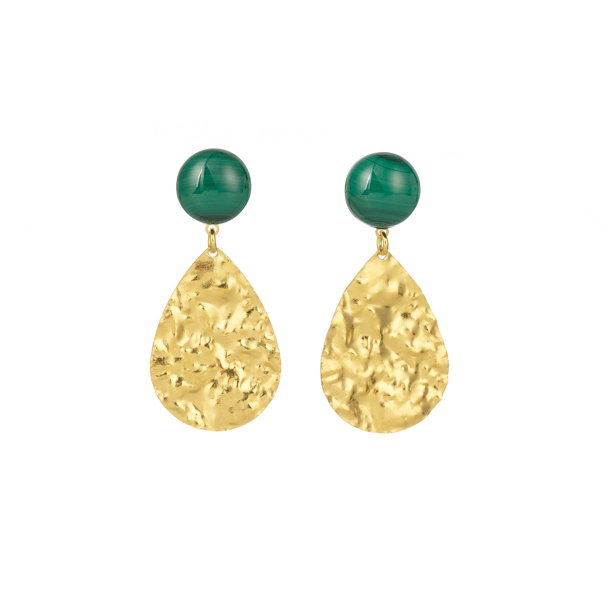 Les boucles d'oreilles Marine mettent en avant une goutte dorée martelée associée à une pierre naturelle iconique : la malachite, reconnaissable à son vert profond veiné. Ce duo couleur-texture crée une contraste moderne et lumineux.