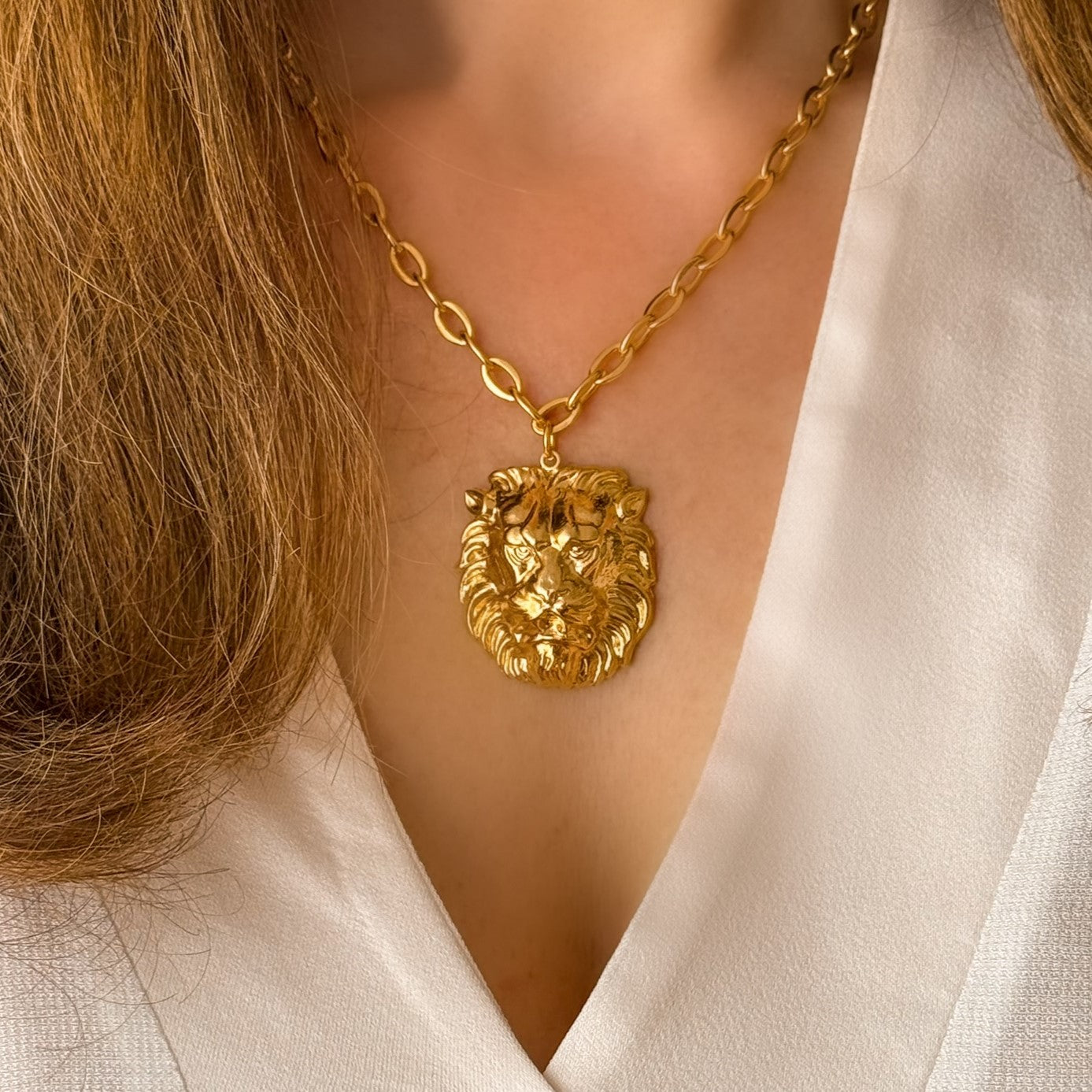 En solo, pour un look minimaliste et élégant, laissant le pendentif lion devenir le point central. En superposition, avec des chaînes fines dorées pour un style plus mode et lumineux. Avec un col rond, une chemise ouverte ou un pull fin pour mettre en valeur la brillance de la dorure 24 carats.